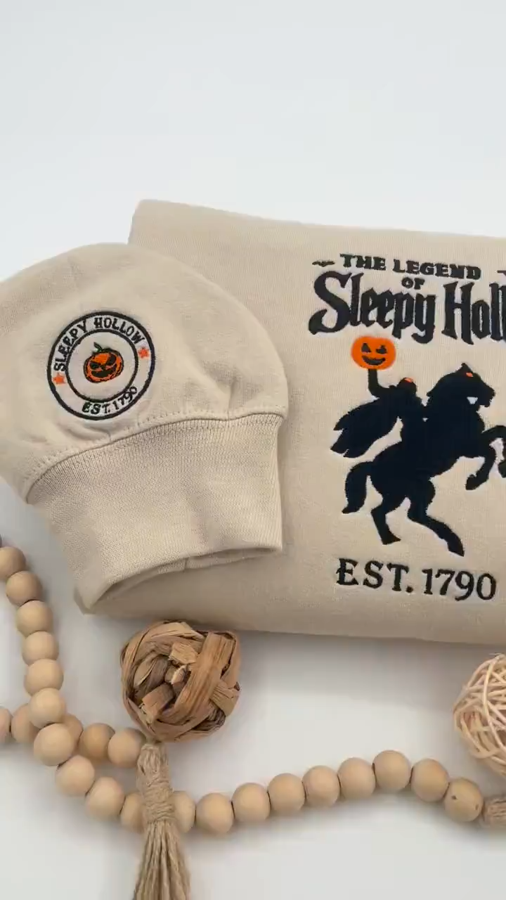Sleepy Hollow Embroidered Halloween Sweatshirt – Headless Rider & Pumpkin Sleeve Crewneck