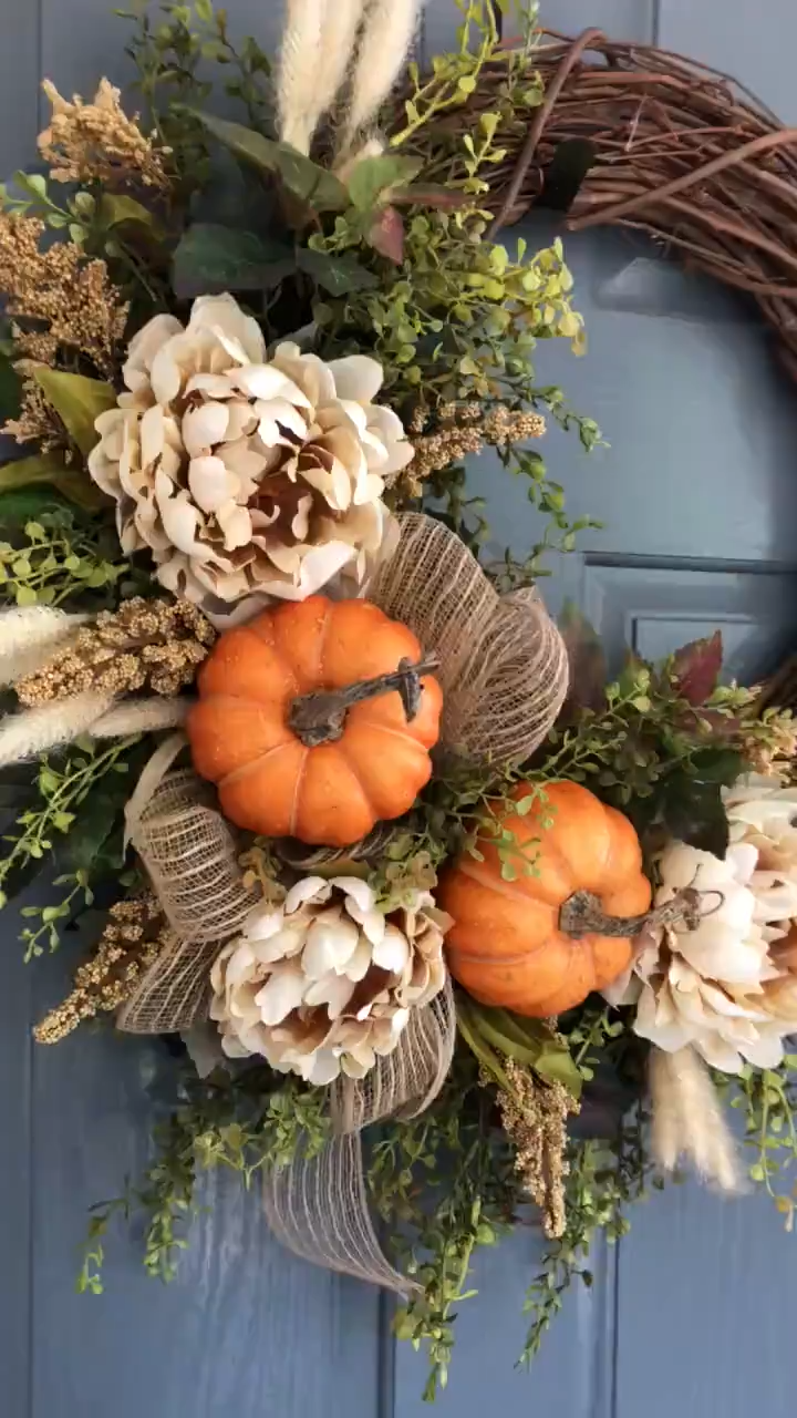 • Handmade with premium artificial fall leaves, artificial orange pumpkins, peonies, and berries